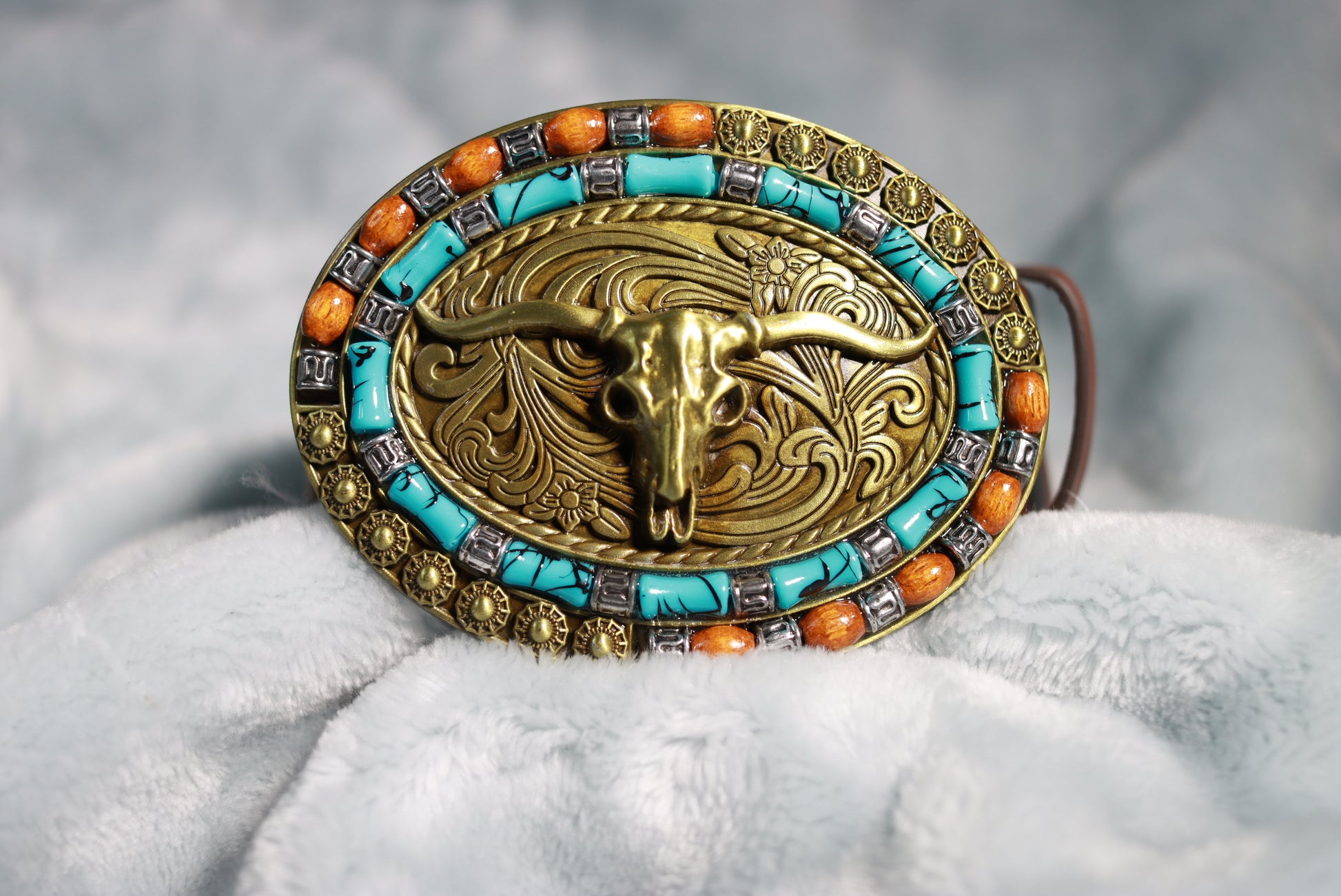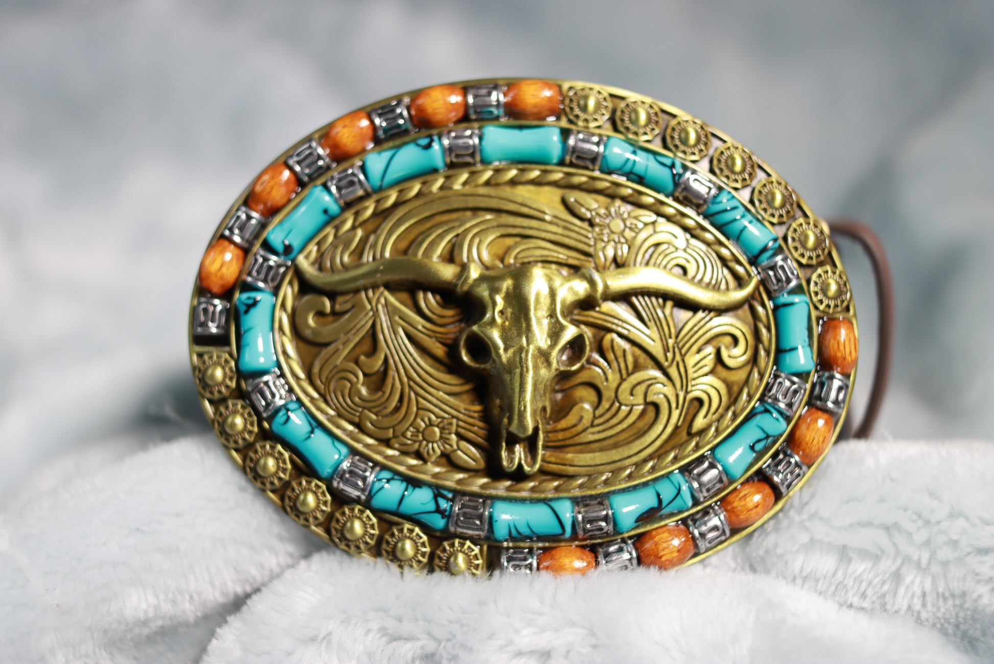 Large Brass Steer Skull and Stones Buckle Western Cowboy Belt