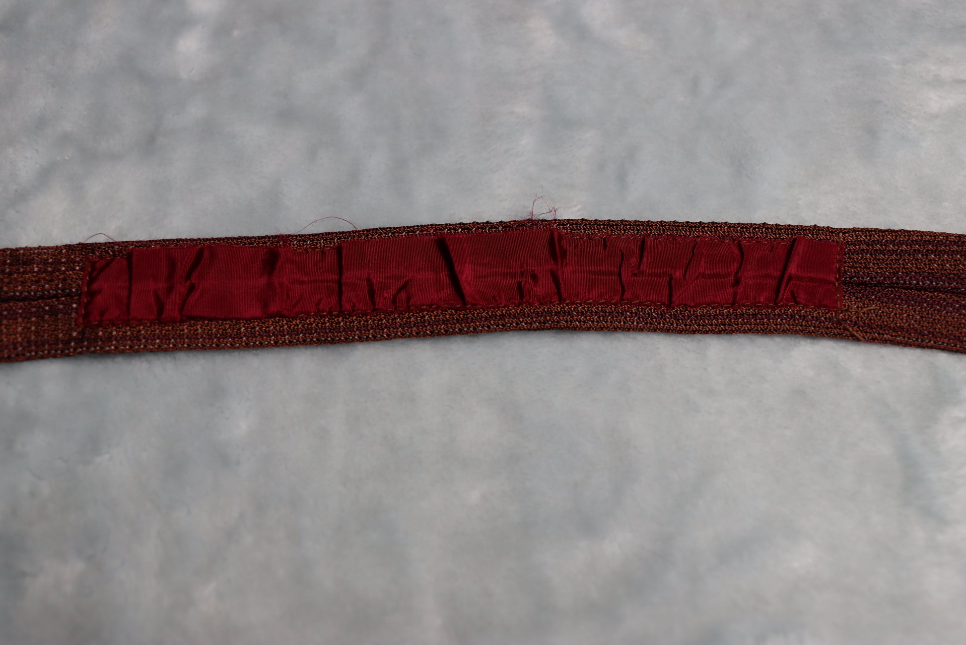This is a bit of a conundrum. It appears to be a sort of cross between a cravat and a tie. It has a reinforcing patch at the back of the neck. One end is slightly narrower and quite a bit shorter. Tied this will be a short tie.