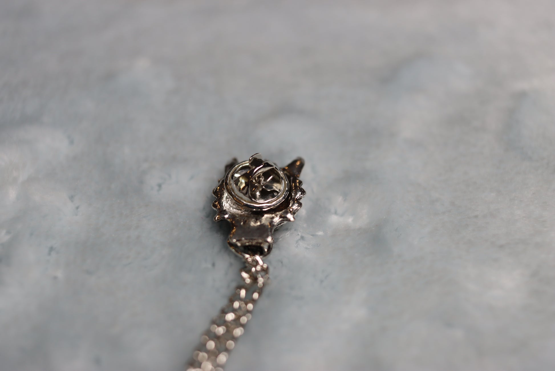 Pins to collar tips and chain hangs over a tie if one is worn.