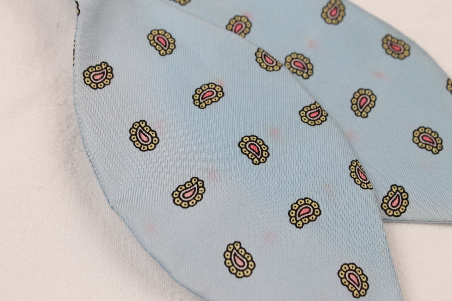 A very nice tie, however, the red colour in the centre of the paisley patterns had transferred, leaving red smudges where they shouldn't be. Priced accordingly.