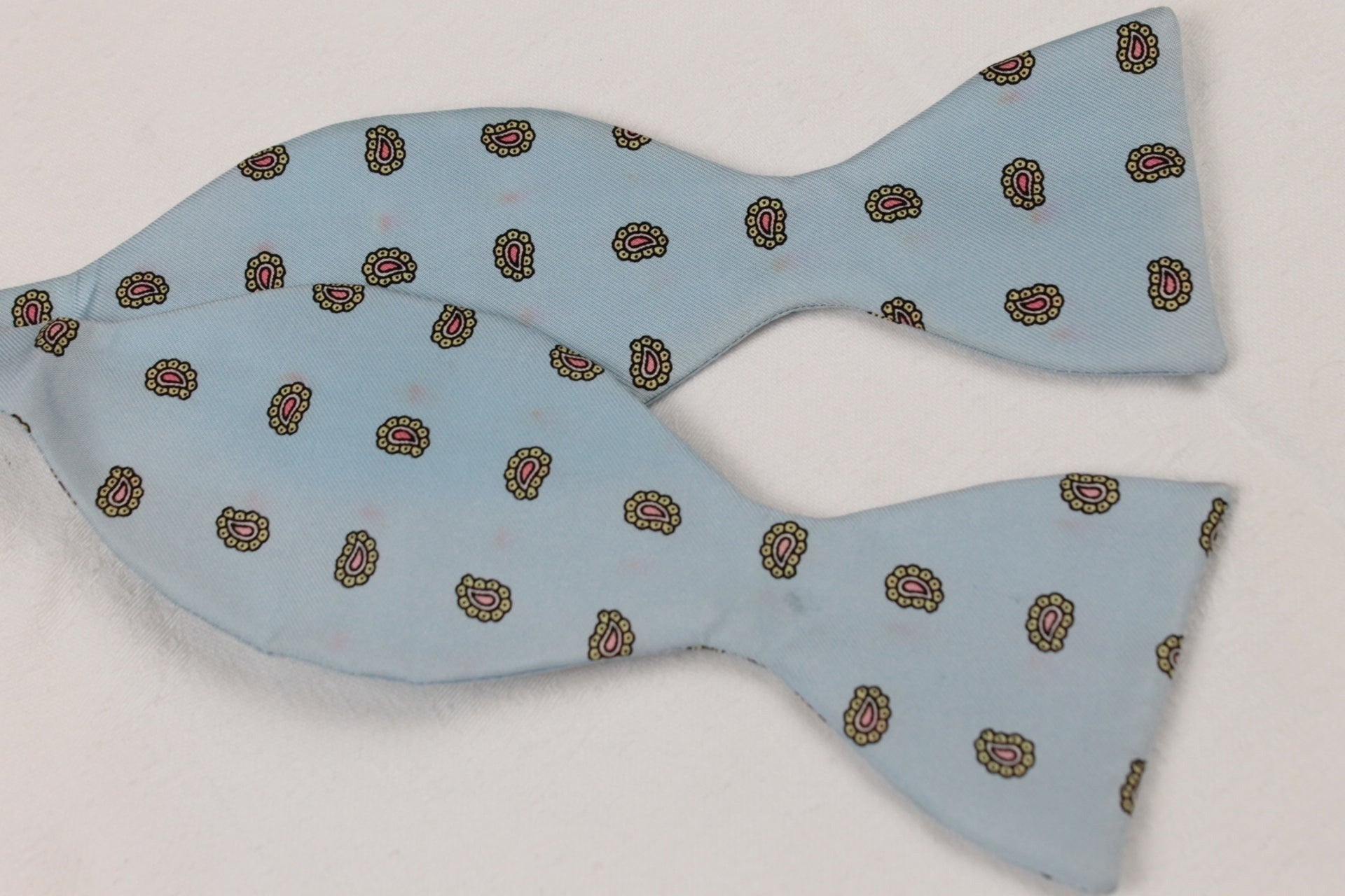 Vintage Pale Blue All Silk Deconstructed Paisley Self Tie Adjustable Thistle Bow Tie