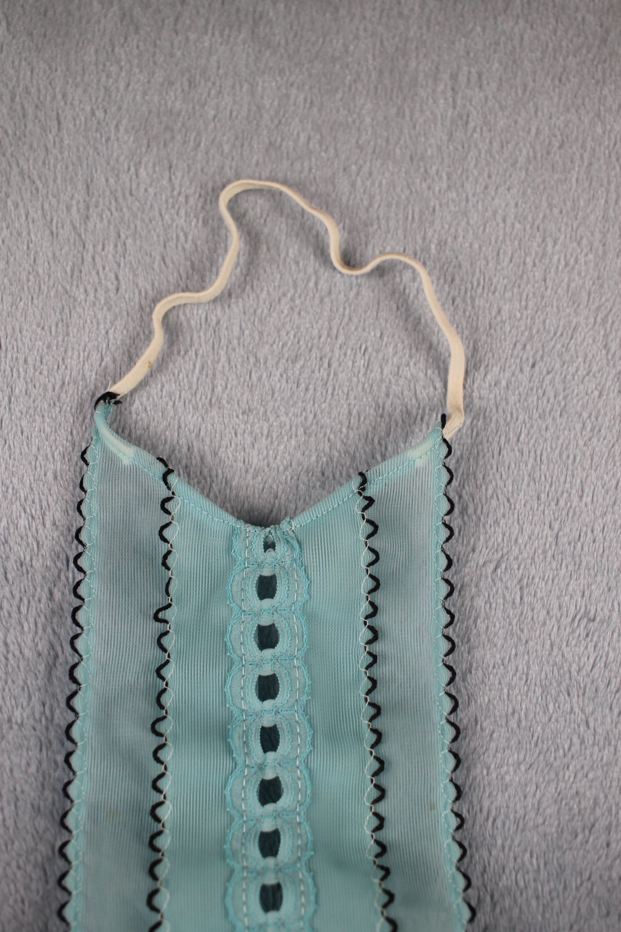 Vintage 1970s light blue black trim elastic neck tie button on shirt ruffle