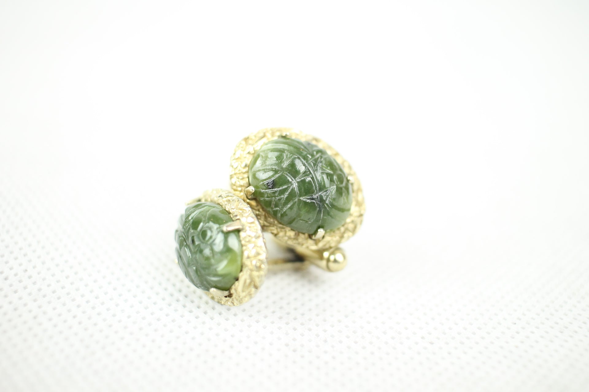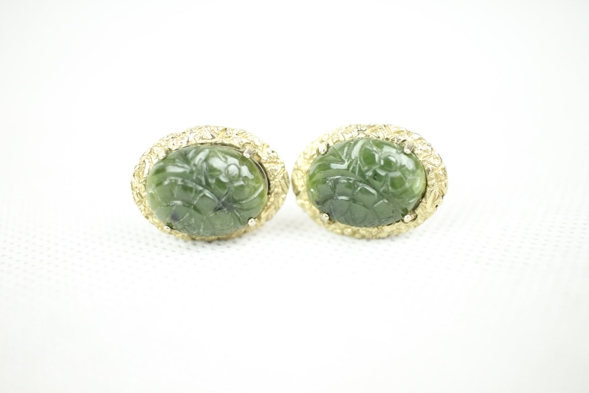 Vintage Anson Carved Oval Green Stone Leaf Pattern Mount Cuff Links