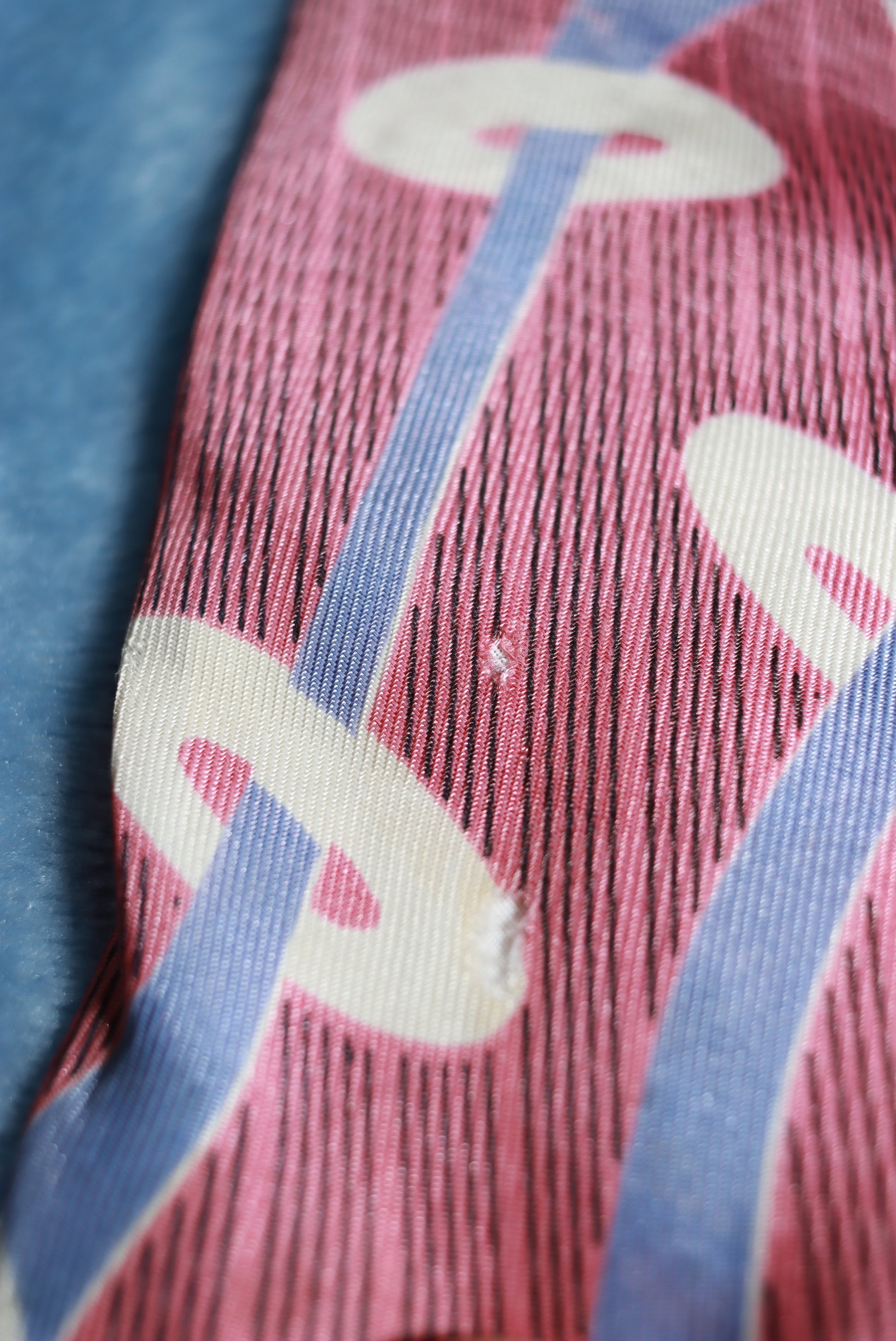 The tie has a tiny hole on the front face as well as a light mark. The back of the tie has a large hole that just reaches the edge. See photos