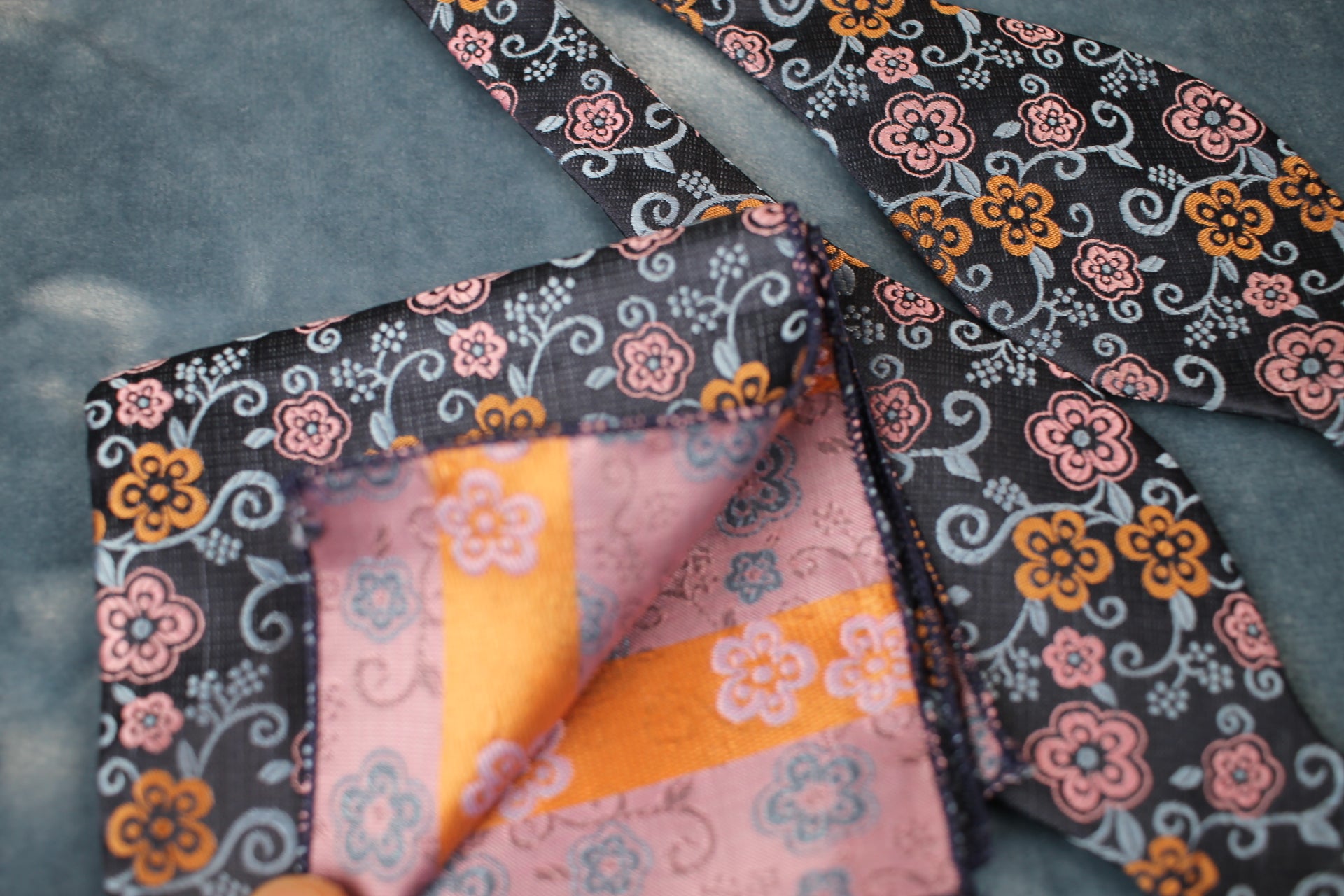 Vintage blue pink copper pattern adjustable self tie bow tie and handkerchief set