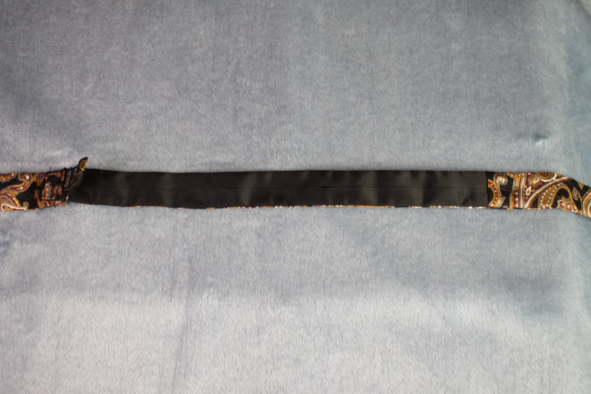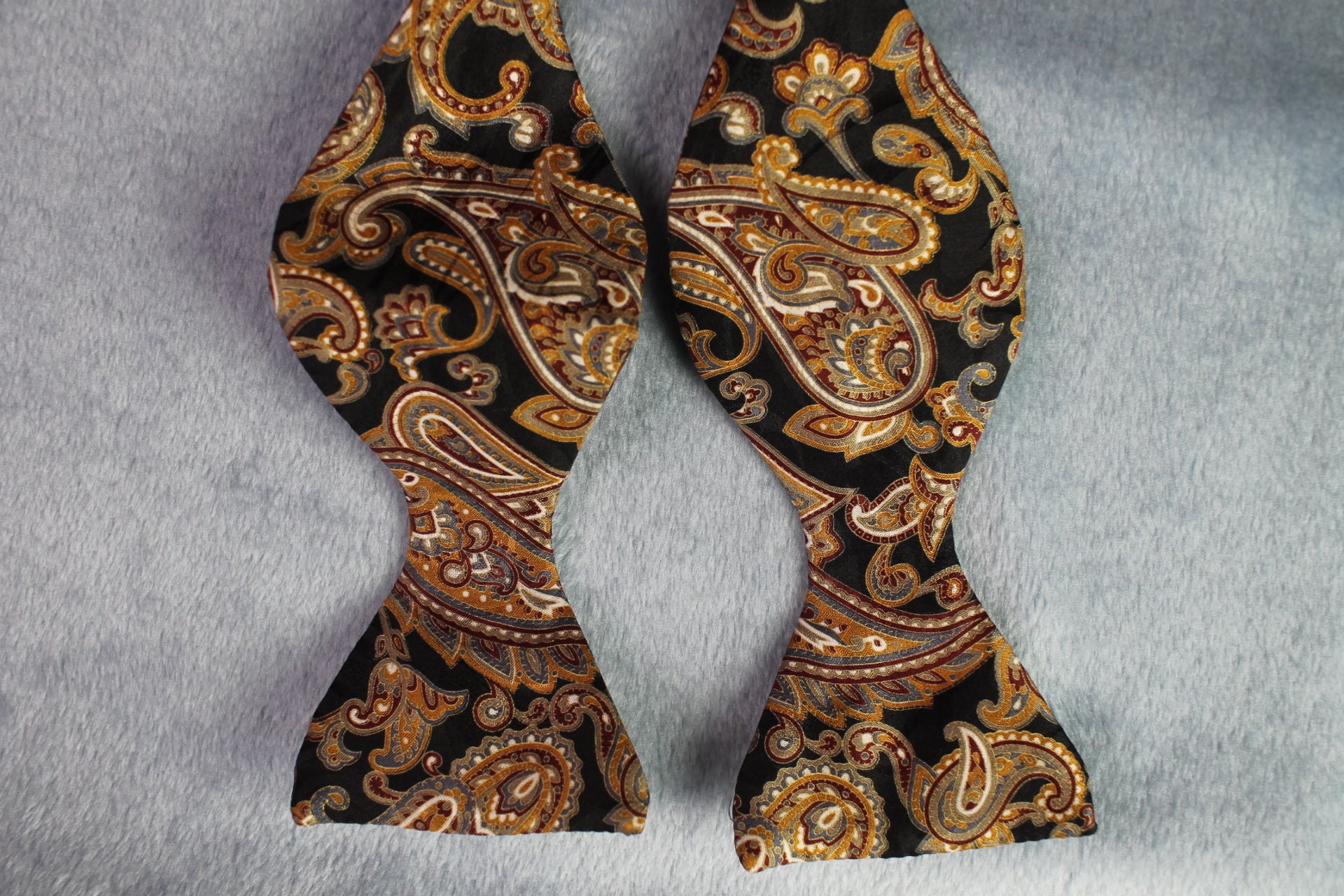 Vintage Frederick Theak silk self tie thistle end black gold paisley bow tie adjustable