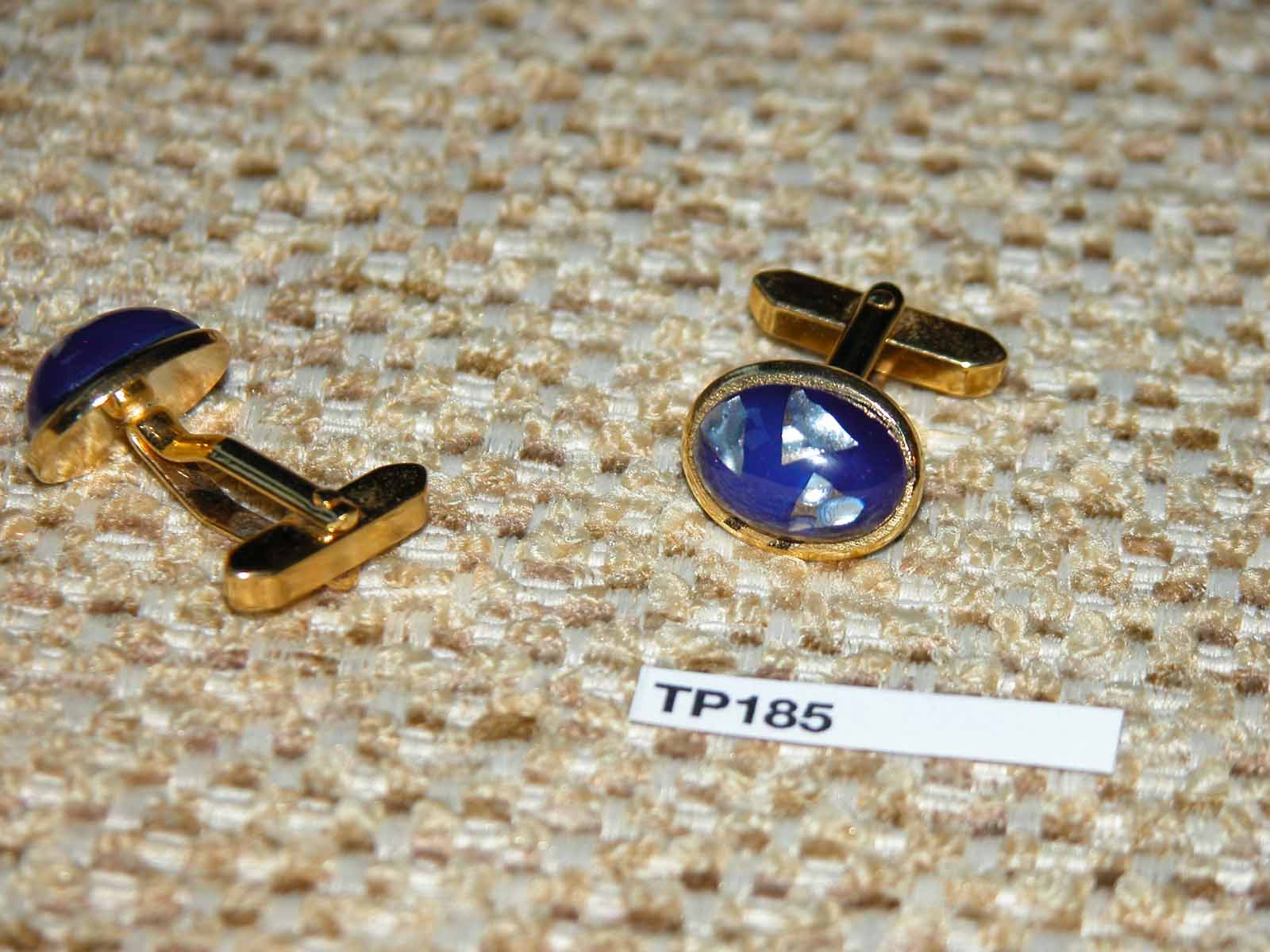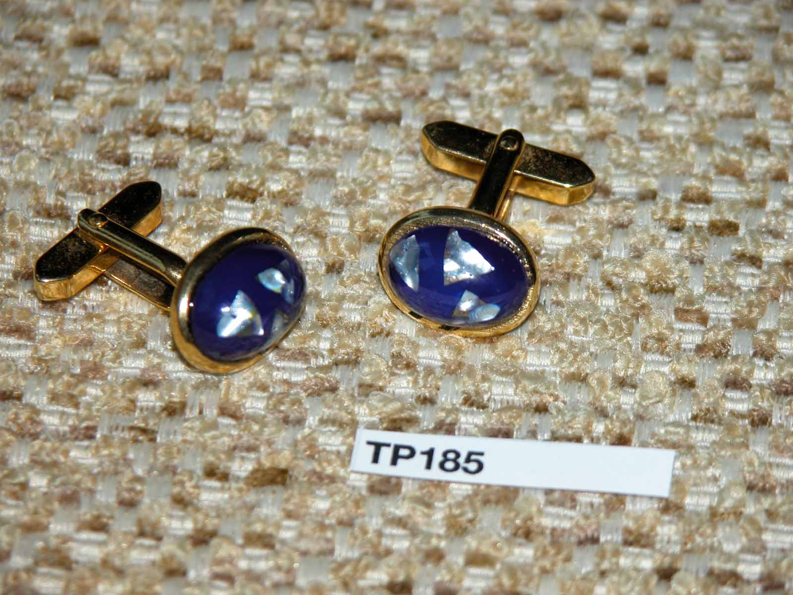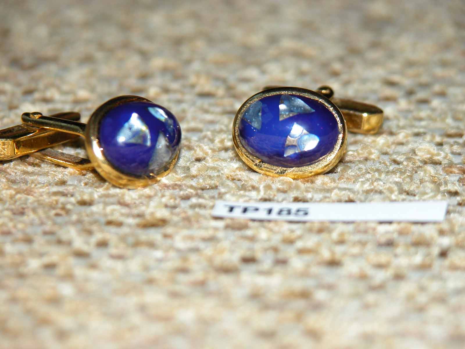Vintage gold metal blue and pearl oval art glass stones cuff links