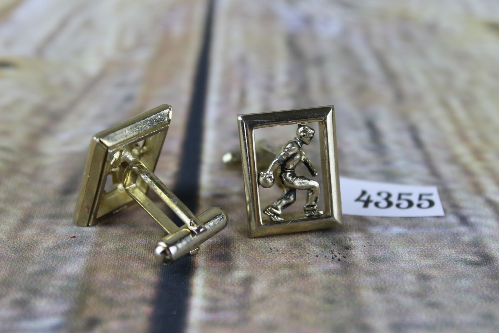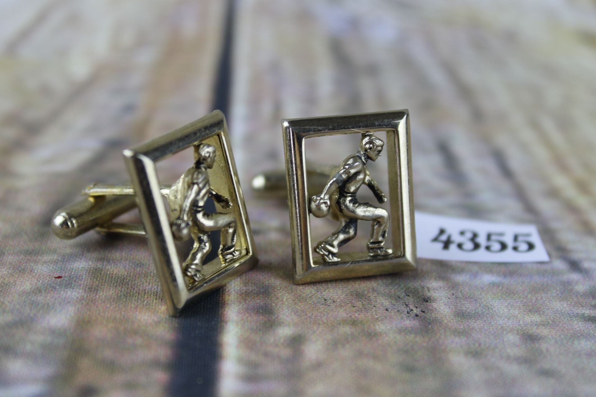 Vintage gold metal figure playing bowls in frame ten pin or crown green cuff links