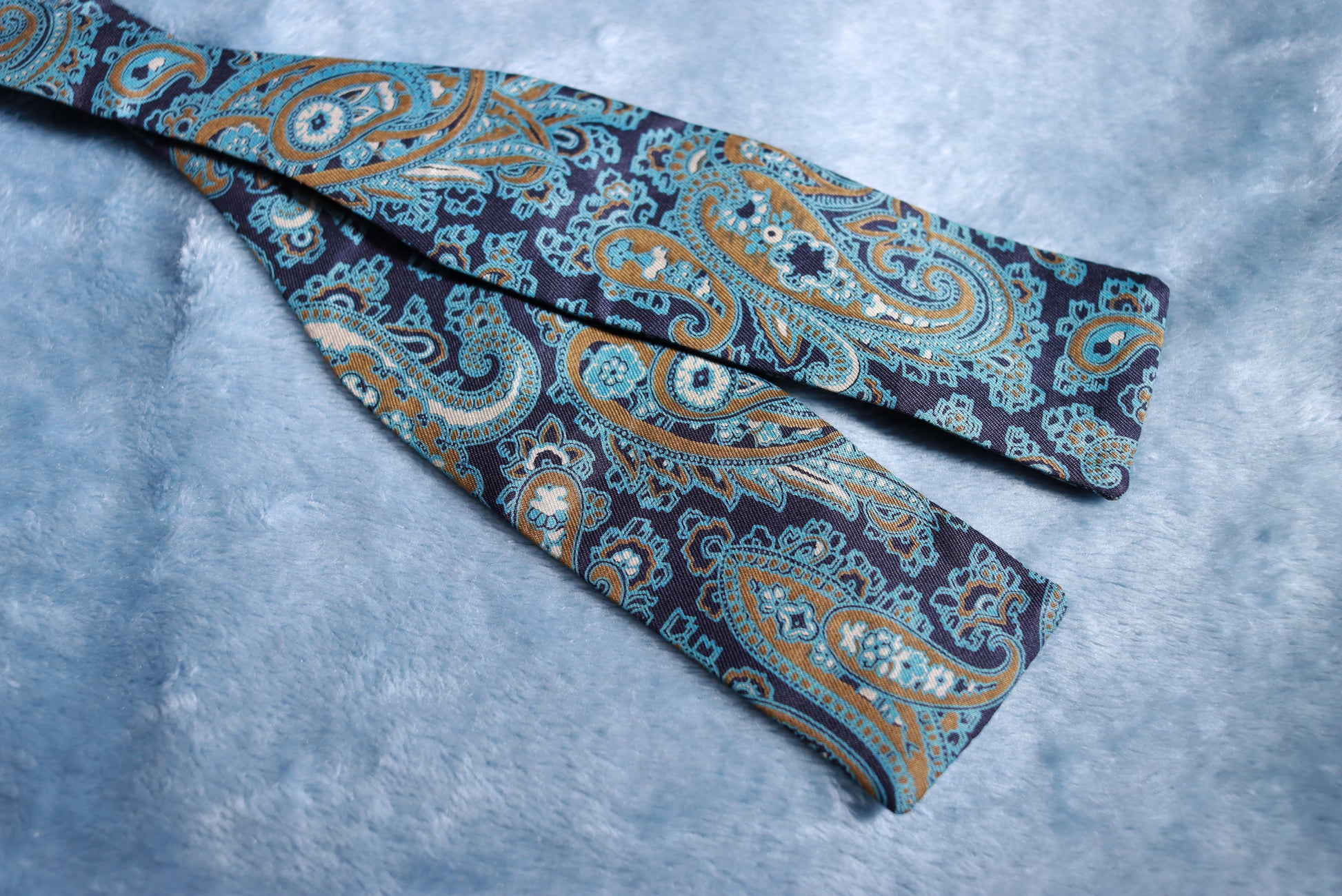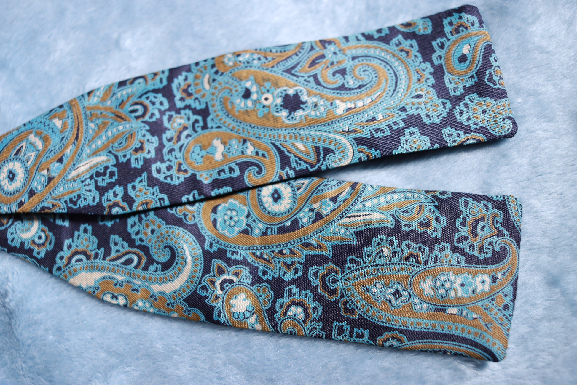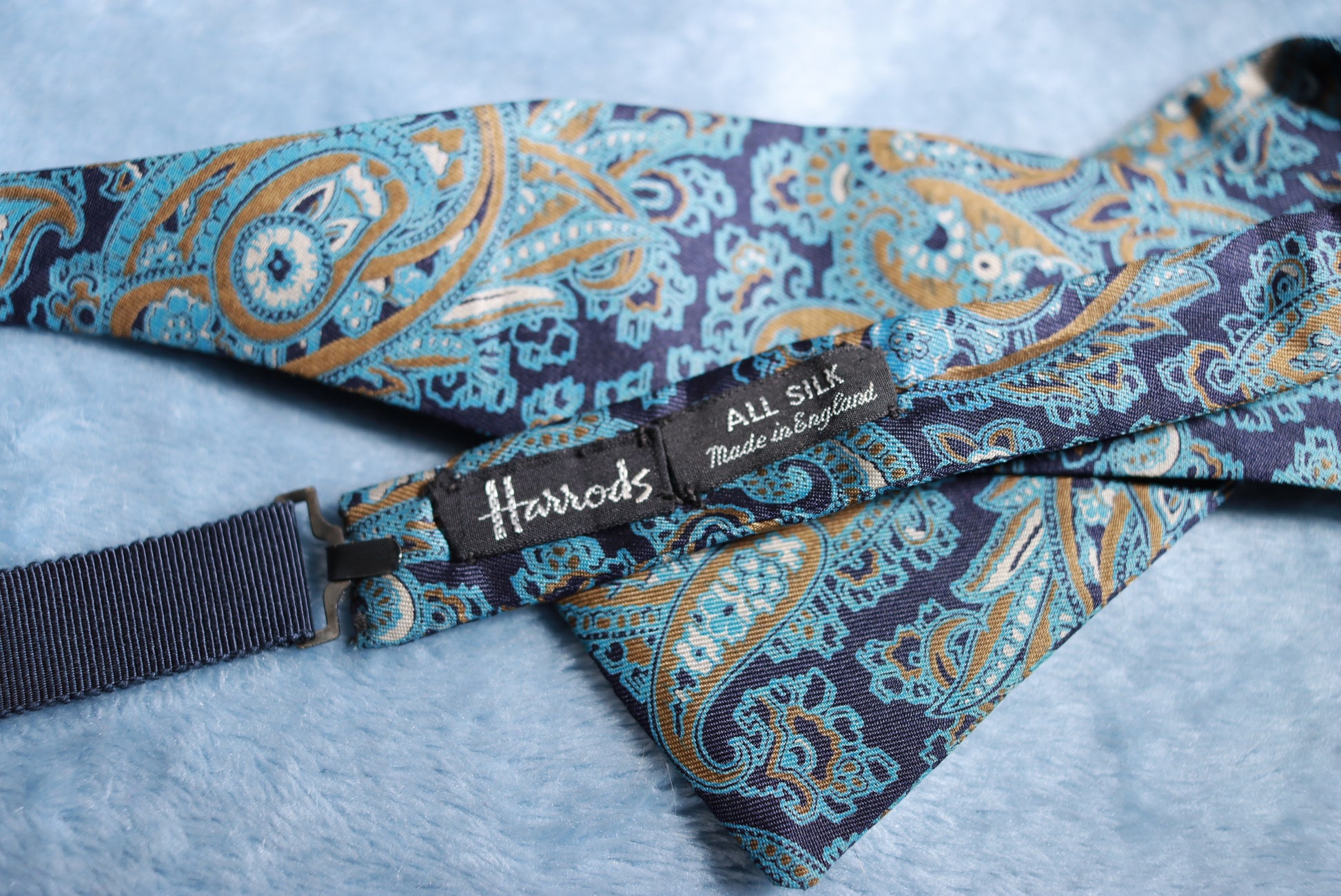 Vintage Harrods Silk Blue Paisley Paddle Bow Tie