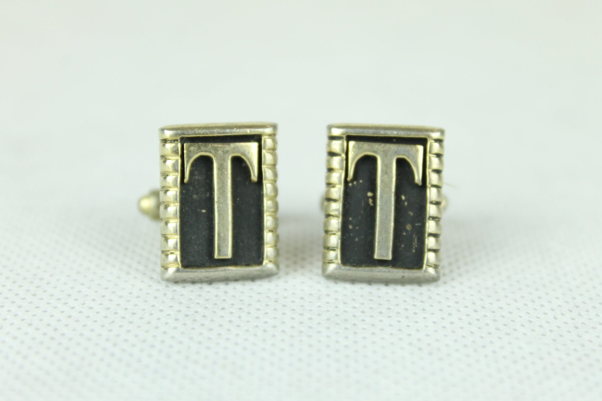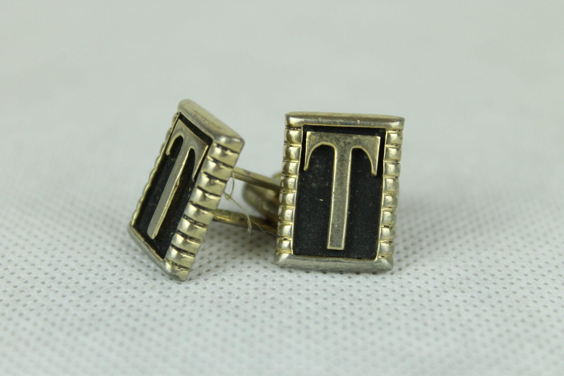 Vintage Initial T Gold & Black Oblong Cuff Links