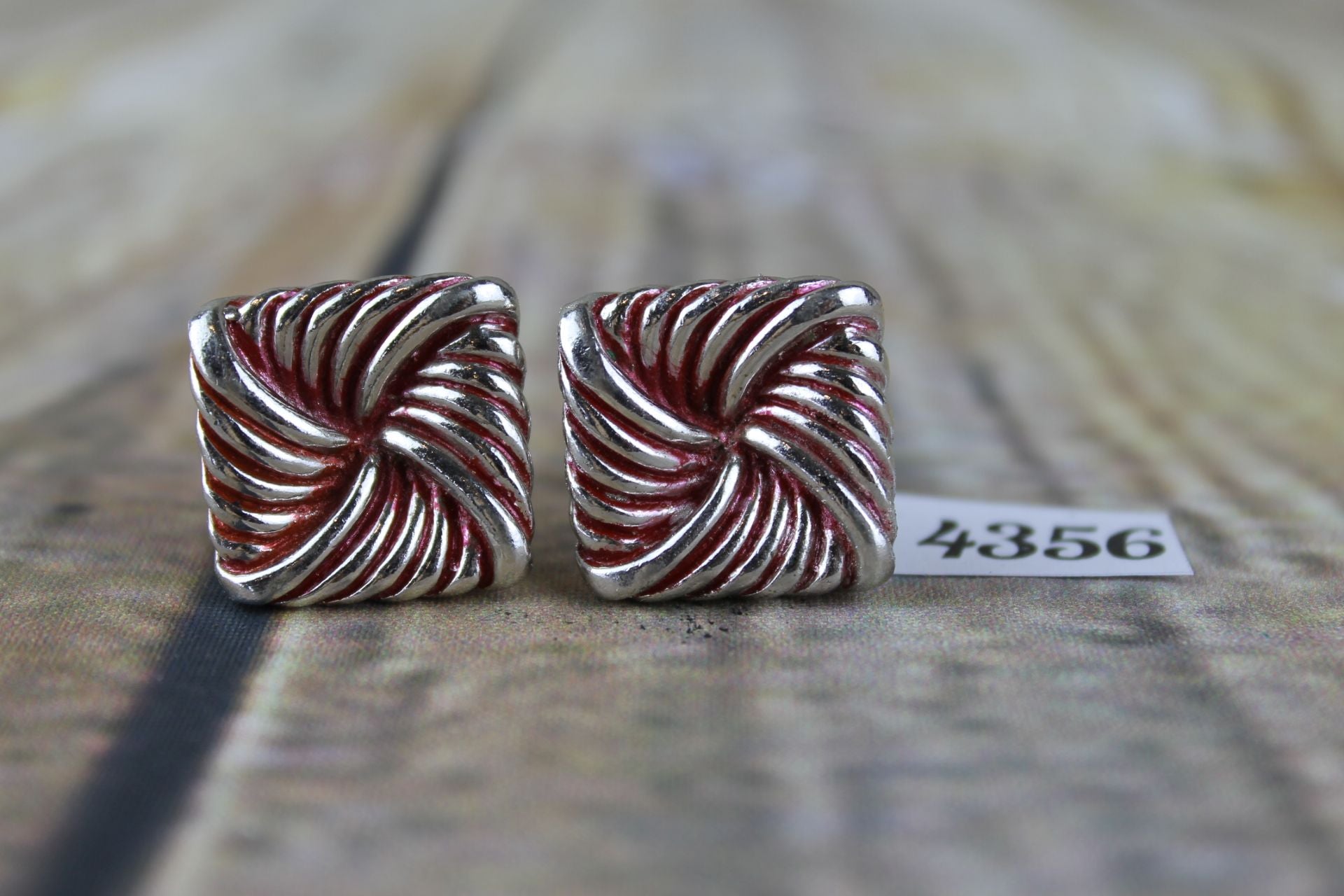 Vintage large square knot silver metal red enamel highlights cuff links