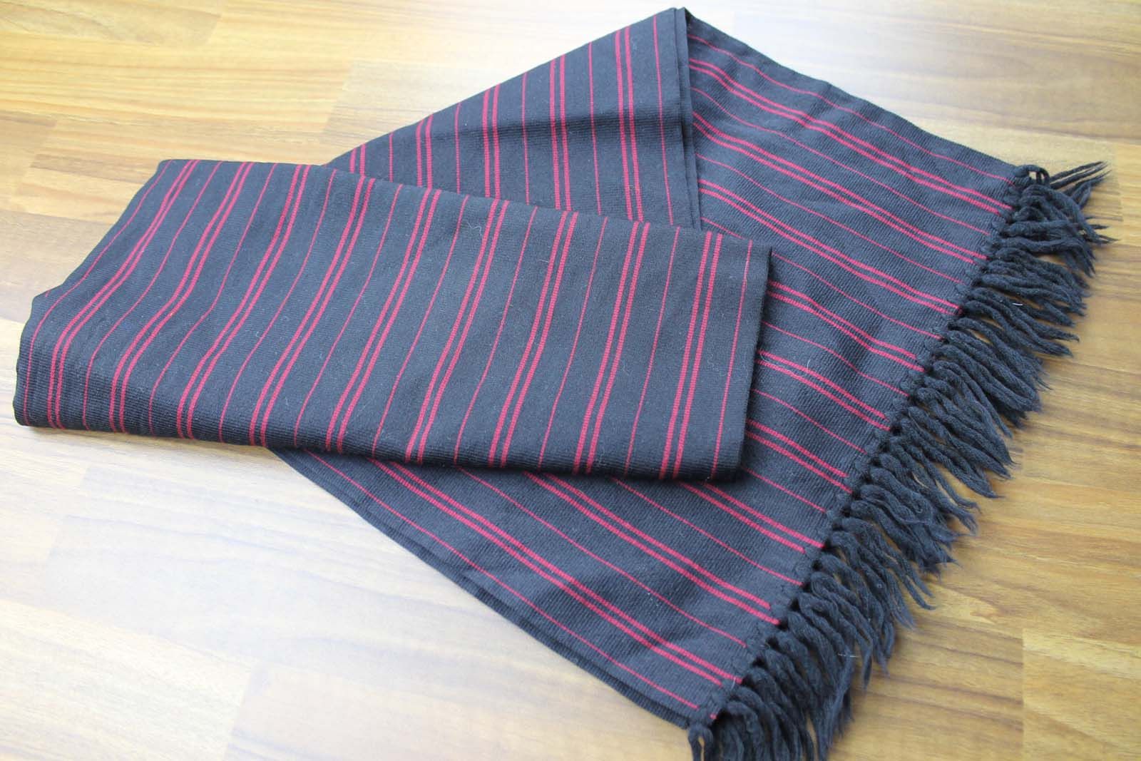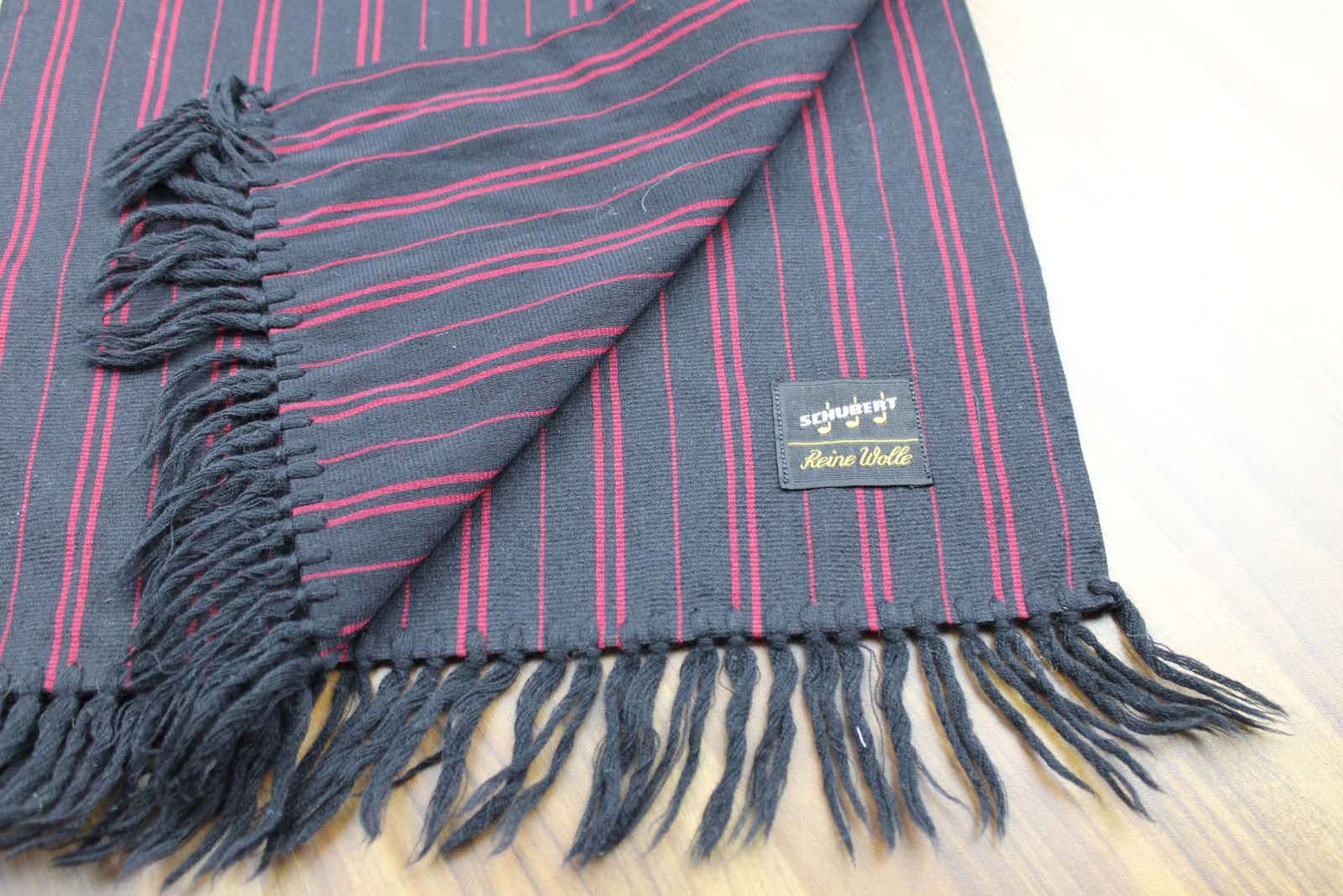 Vintage mens Shubert 100% Wool Burgundy Black Striped Fringed Scarf Retro Mod