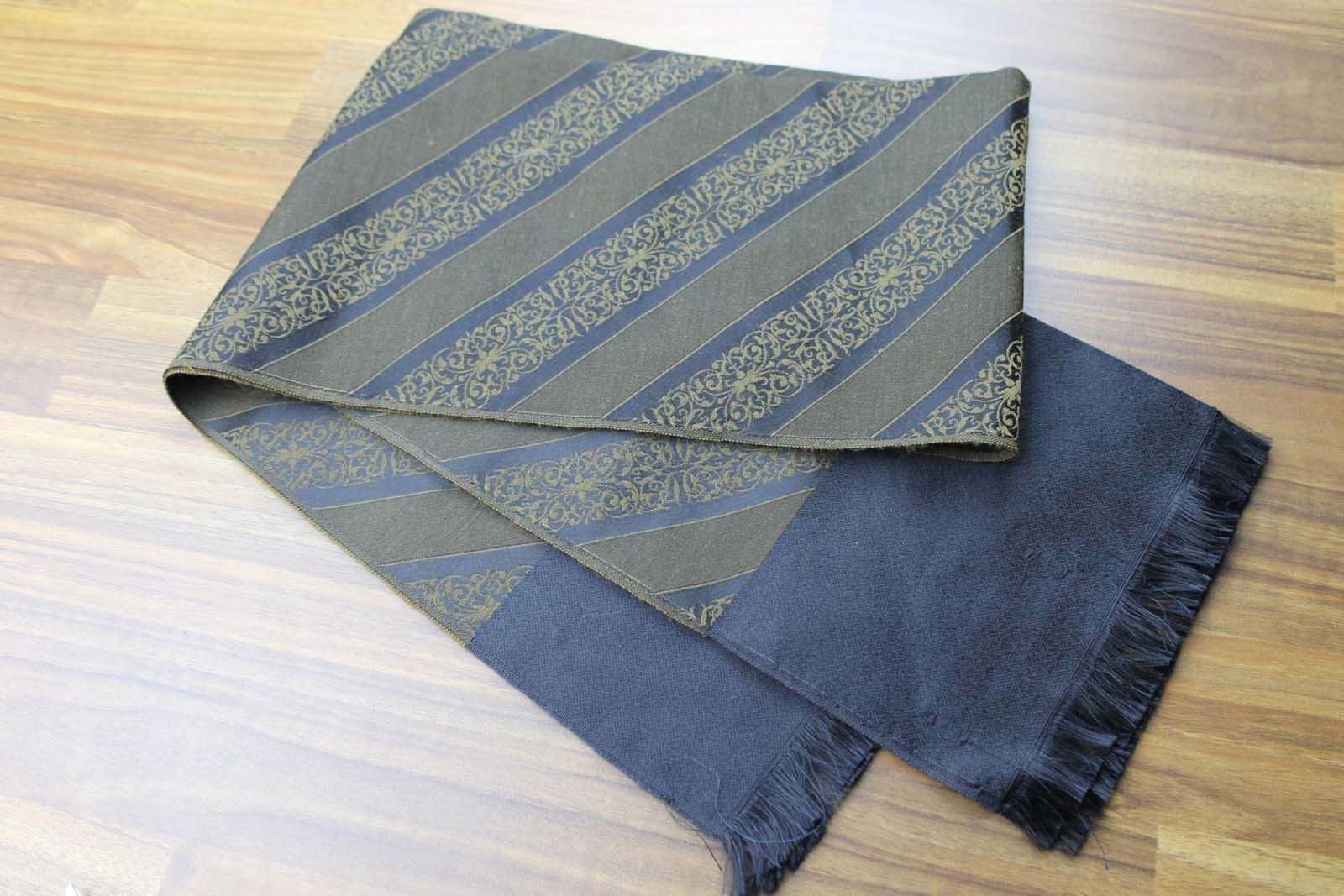 Vintage mens Trevira Olive Black Striped Fleur De Lys Fringed Scarf Retro Mod