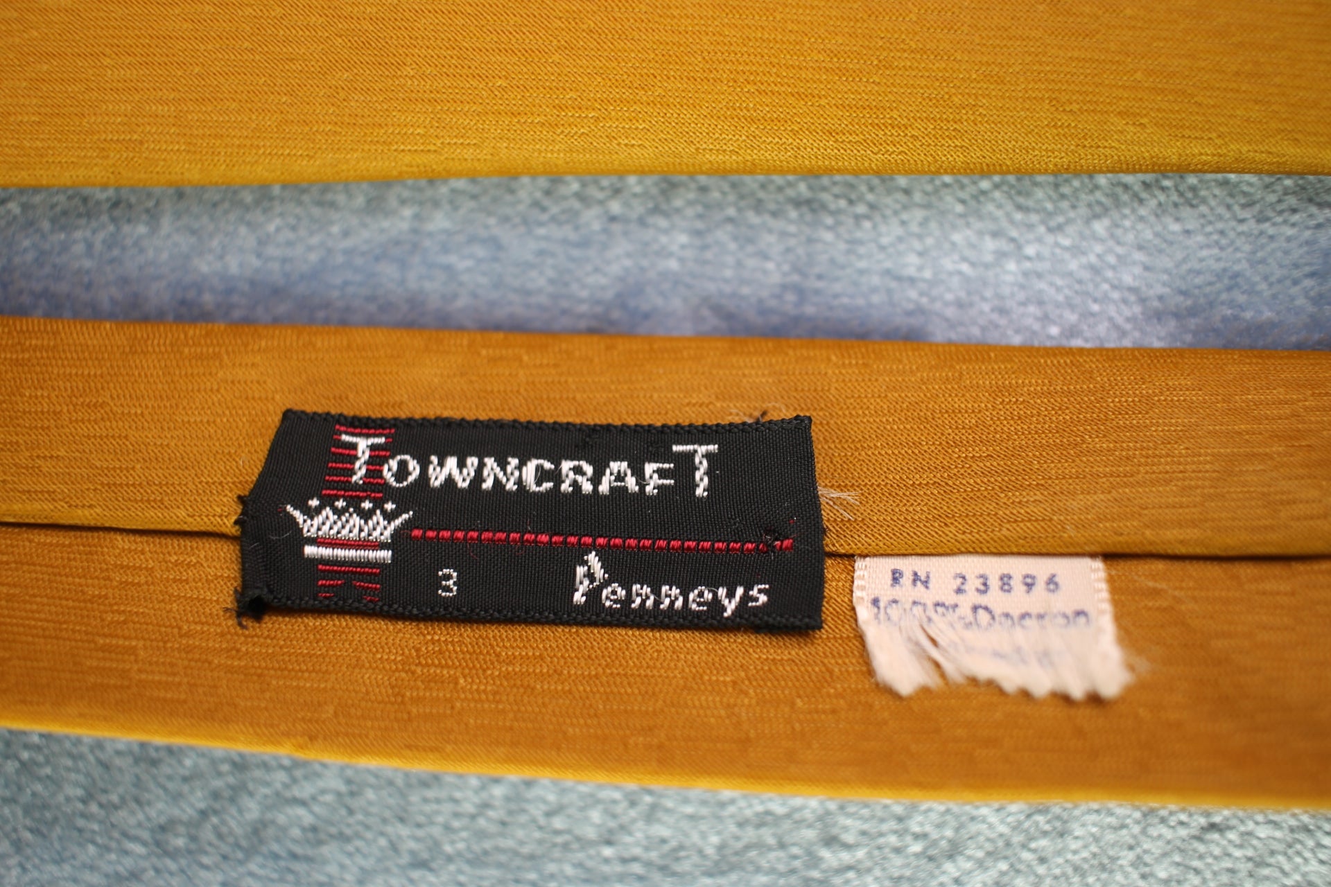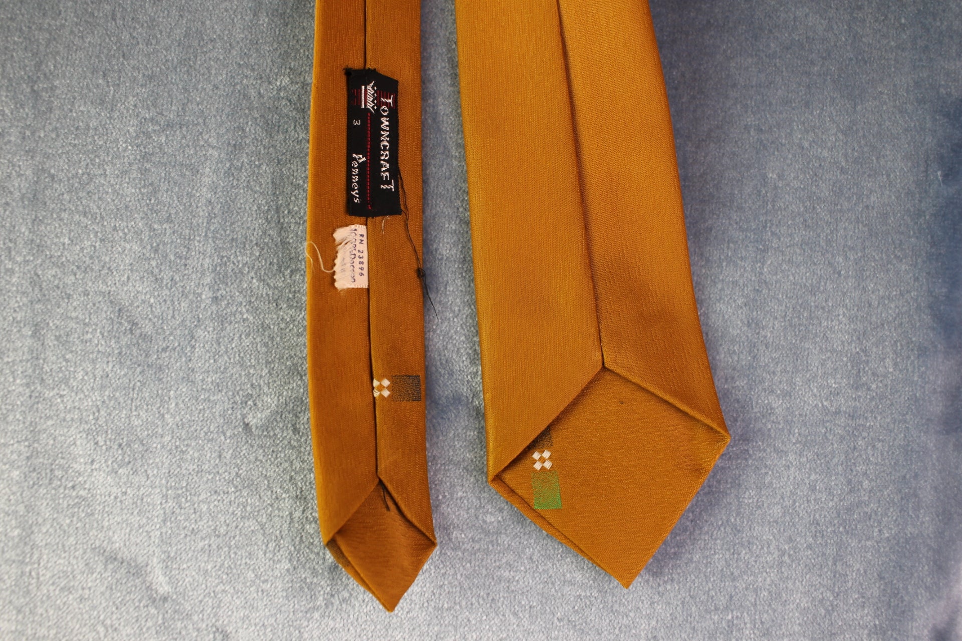 Vintage Penneys Towncraft mustard green black faded motif pattern skinny tie