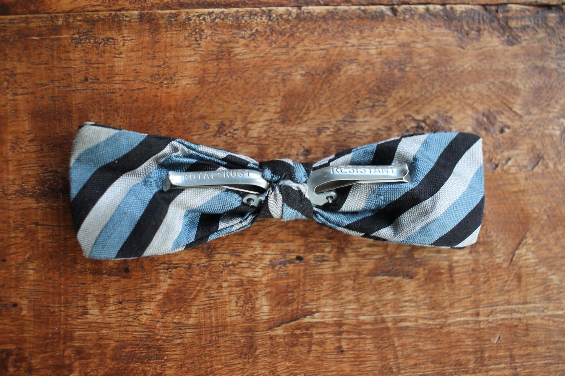 Vintage pre-tied clip on blue black silver striped bow tie