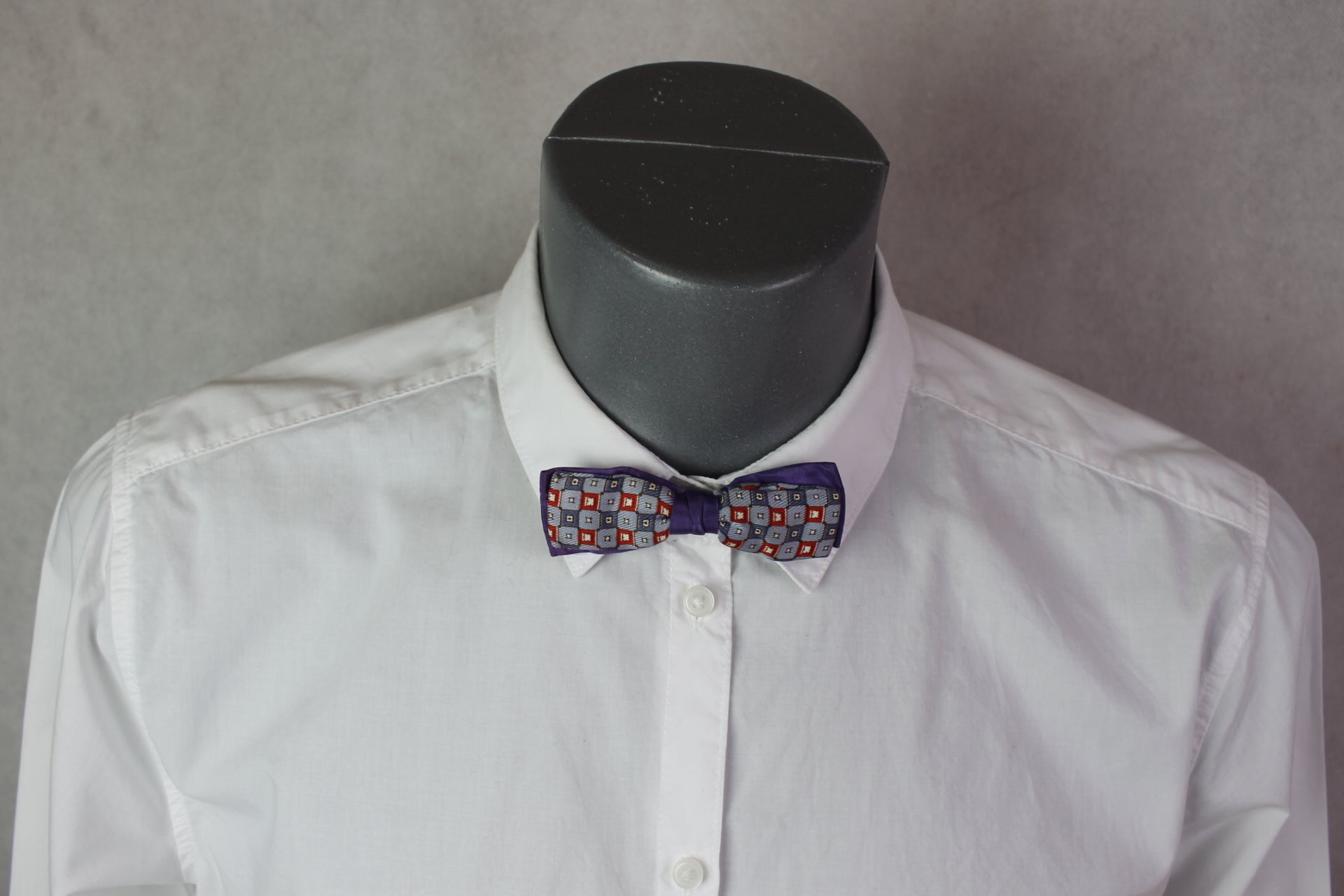 Vintage pre-tied clip on blue red on purple background pattern bow tie