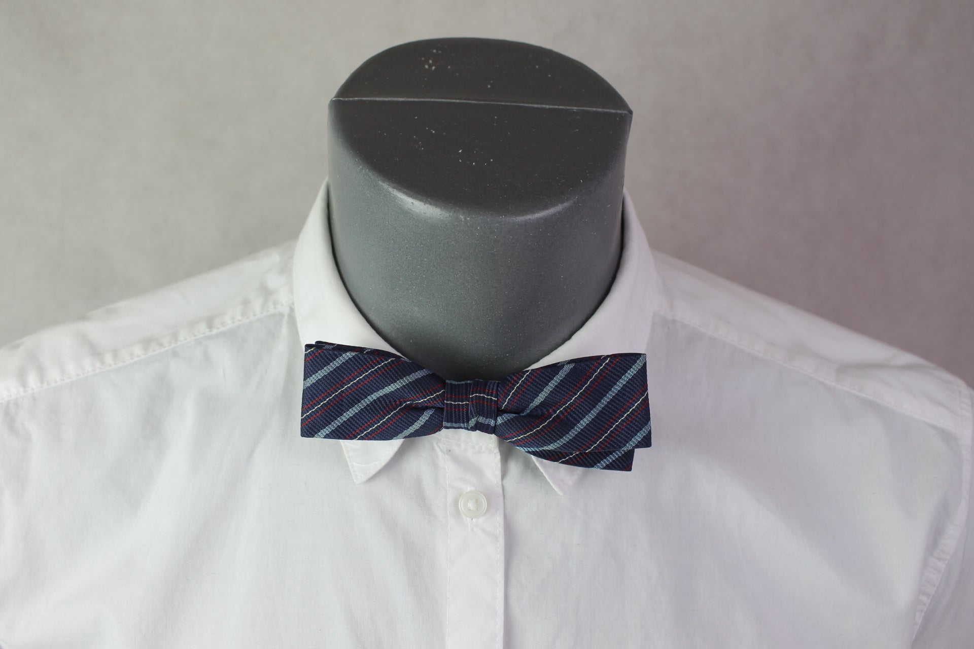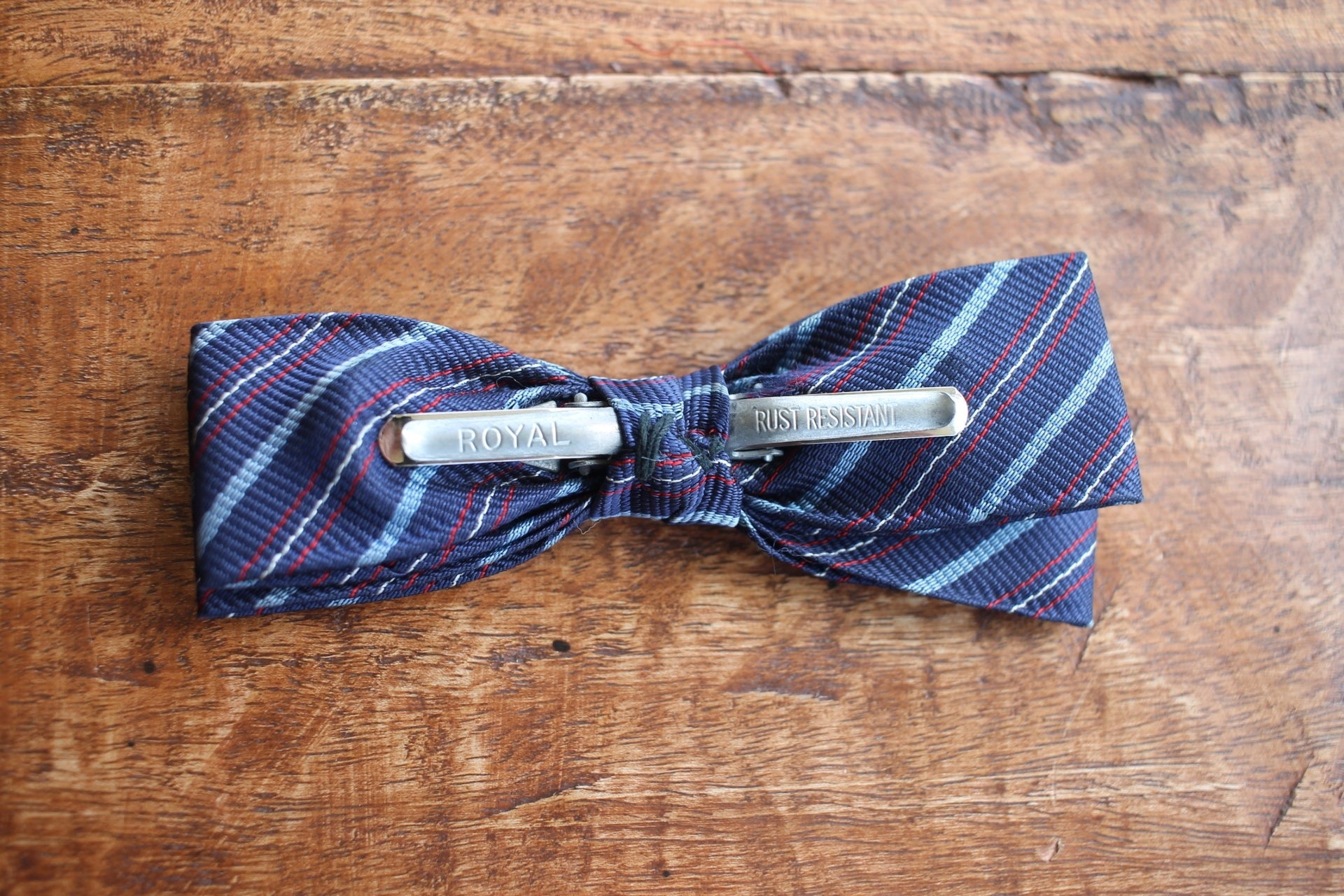 Vintage pre-tied clip on blue silver red striped pattern bow tie
