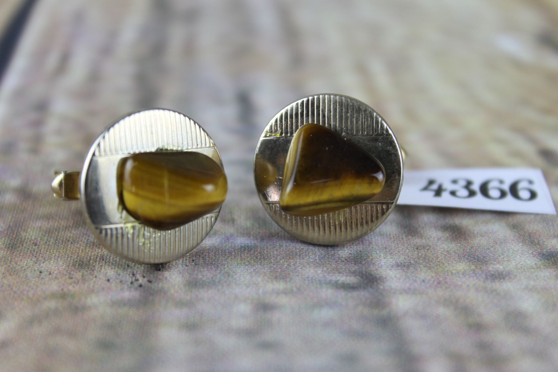 Vintage round gold metal tigers eye stones cuff links