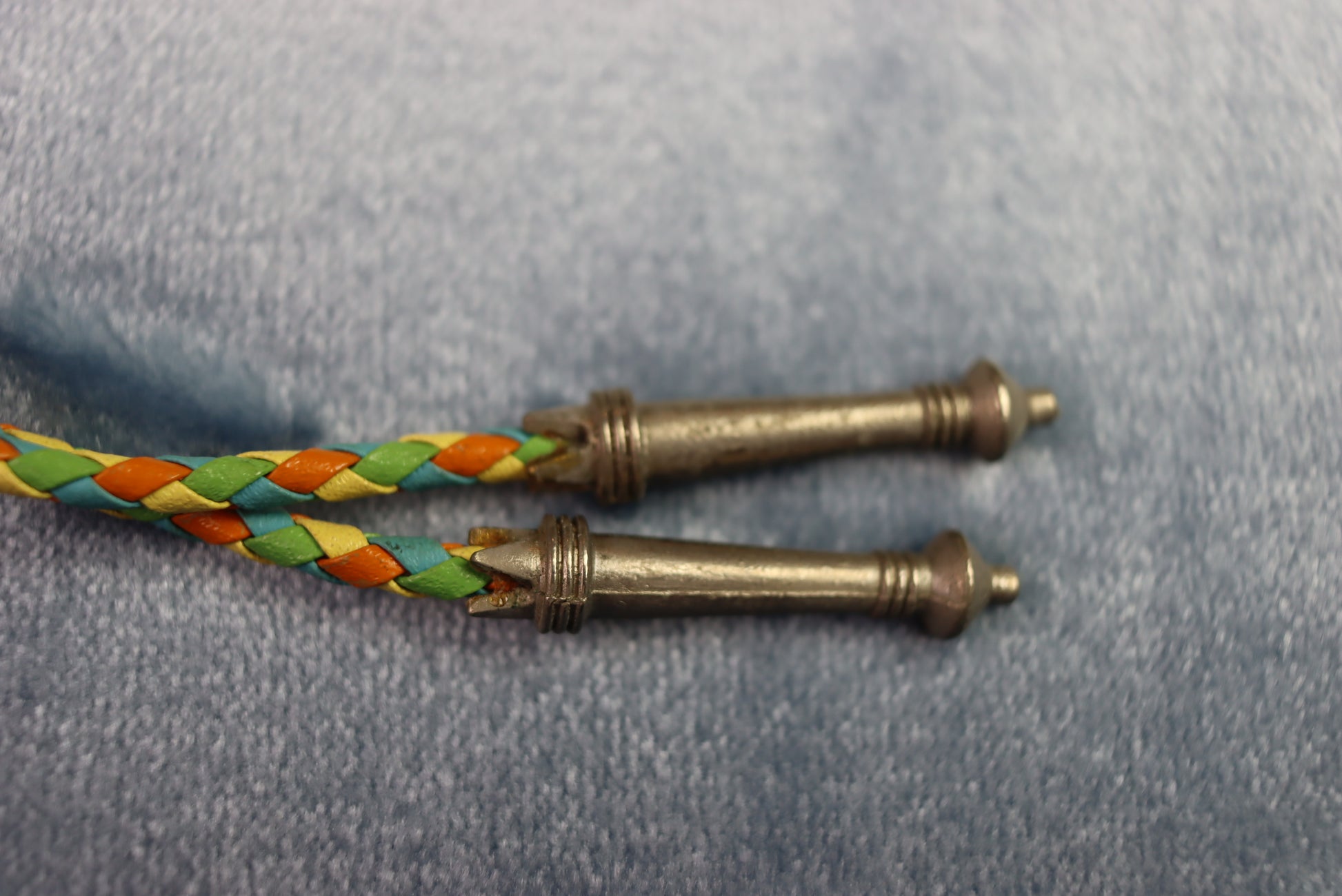 Multicoloured woven cord (90cm total length approx), heavy metal aiglets.