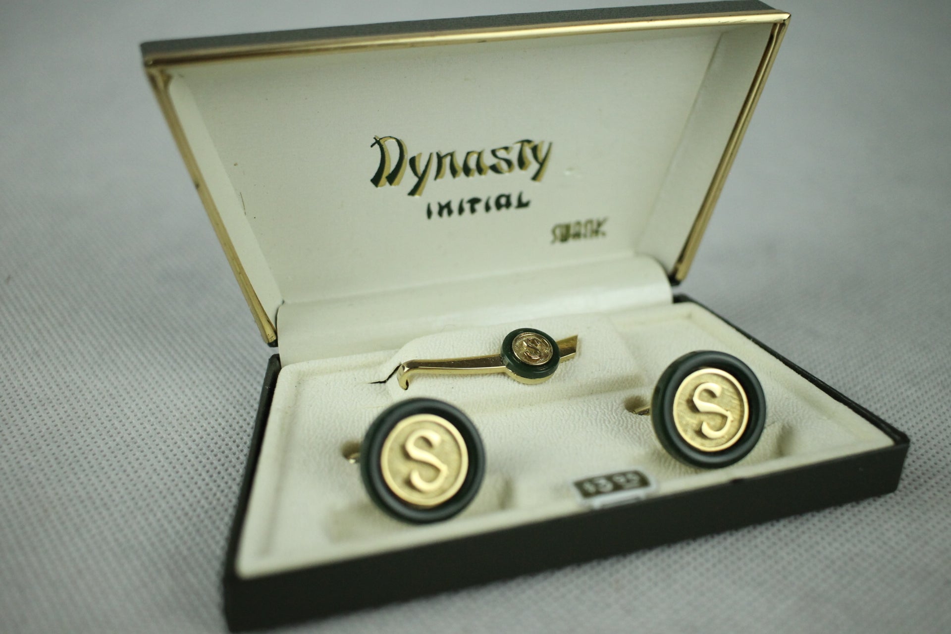 Vintage Swank Dynasty Initial S Jade & Gold Cufflink Set