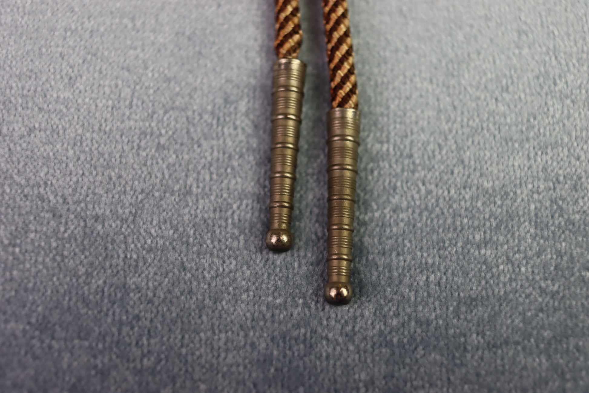 Striped woven cord (84cm total length approx), dark metal aiglets.
